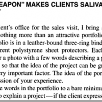 Because I needed some kind of an edge during interviews, I created my own portfolio in the same style that Marc had made for himself. I find it very useful during interviews to not only as a visual reference for the employer/client, but also as an aid to myself to keep track of the various achievements which may be of interest to the employer. The clients seem to be impressed and interested in the portfolio contents, and as the saying goes a picture is worth a thousand words.